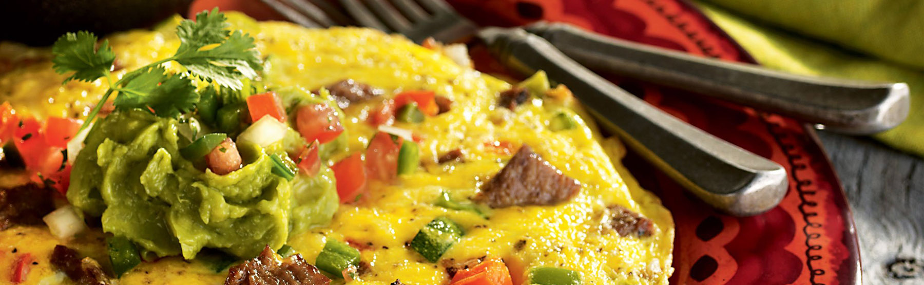 Chorizo, steak and cheese. Topped with green and red salsa. Served with home fries
